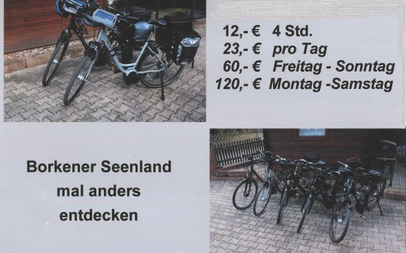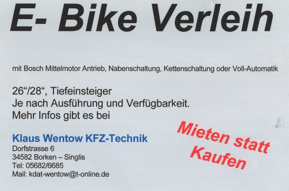 Klaus Wentow aus dem Borkener Stadtteil Singlis hat sich vor kurzer Zeit neben seiner Kfz-Werkstatt ein zweites Standbein mit einem E-Bike Verleih geschaffen. In seinem Fuhrpark befinden sich acht Räder (Tiefeinsteiger) mit unterschiedlicher Ausstattung und Größen je nach Ausführung und Verfügbarkeit.
