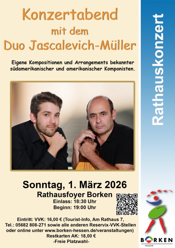 Mit einem besonderen musikalischen Highlight startet die Stadt Borken (Hessen) in die Rathauskonzerte 2026. Am Sonntag, 1. März 2026, um 19:00 Uhr gastiert das Jazz-Duo