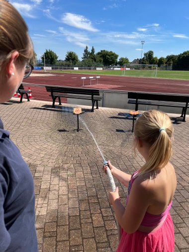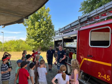 Am Mittwoch, 3. August, besuchten die Jugendwarte und Betreuer Tina Werner, Pascal Bernhardt, Anna-Lena Janssen, Tim Eggers, Luisa Rauthe sowie Noah Bernhardt und Paul Krell die Kinderferienspiele am Borkener Blumenhainstadion. Aufgeteilt in drei Gruppen wurden den Kindern die Aufgaben der Feuerwehr sowie die Ausrüstungsgegenstände und das richtige Verhalten im Brandfall erklärt. Es wurden Notrufe abgesetzt, Verbände angelegt, Fallklappen umgespritzt und natürlich ein Feuerwehrauto angeschaut. Außerdem wurde noch gemeinsam geübt, wie man ein Teelicht sicher anzündet und wieso Feuer überhaupt brennt. Zudem bestaunten die Kinderaugen noch den komplett ausgerüsteten Kameraden Tim. Schnell vergingen knapp drei Stunden und die Kinder konnten viele neue Eindrücke sammeln und wissen nun mehr über das richtige Verhalten in Gefahrensituationen. Die Jugendwarte freuen sich schon auf nächstes Jahr und hoffen, das ein oder andere Gesicht in der Kinder- oder Jugendfeuerwehr wieder zu sehen!