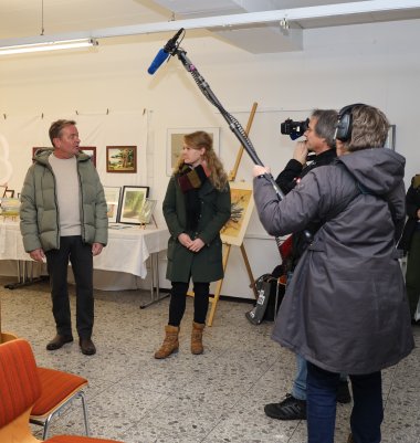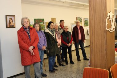 Die Montagsmaler*innen präsentieren ihre Gemälde in einer Ausstellung.