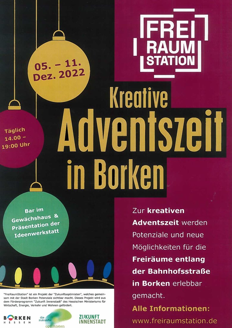 Noch bis Sonntag können täglich von 14:00 bis 19:00 Uhr in den FreiRaumStationen unterschiedliche Ausstellungen besichtigt werden. In dem Gewächshaus des ehemaligen Blumenhauses Ochs, Bahnhofstraße 32, wird es eine Bar und unterschiedliche Lichtinstallationen geben. In der ehemaligen Metzgerei Hempler, Bahnhofstraße 95, werden die Ideen, die Bürger*innen bei den Workshops abgegeben haben, gezeigt. Gerne werden hier auch weitere Vorschläge angenommen. Die Krippenausstellung mit 200 verschiedenen Krippen aus aller Welt ist im ehemaligen Hochzeitshaus, Am Tor 1/Ecke Bahnhofstraße, zu sehen. In der Bahnhofstraße 36 im Innenhof des Engelhardtschen Hofes ist beim Borkener Weihnachtsmarkt der Kreativ- und Kunsthandwerkermarkt mit einer großen Vielzahl von kreativen kunsthandwerklichen Produkten.