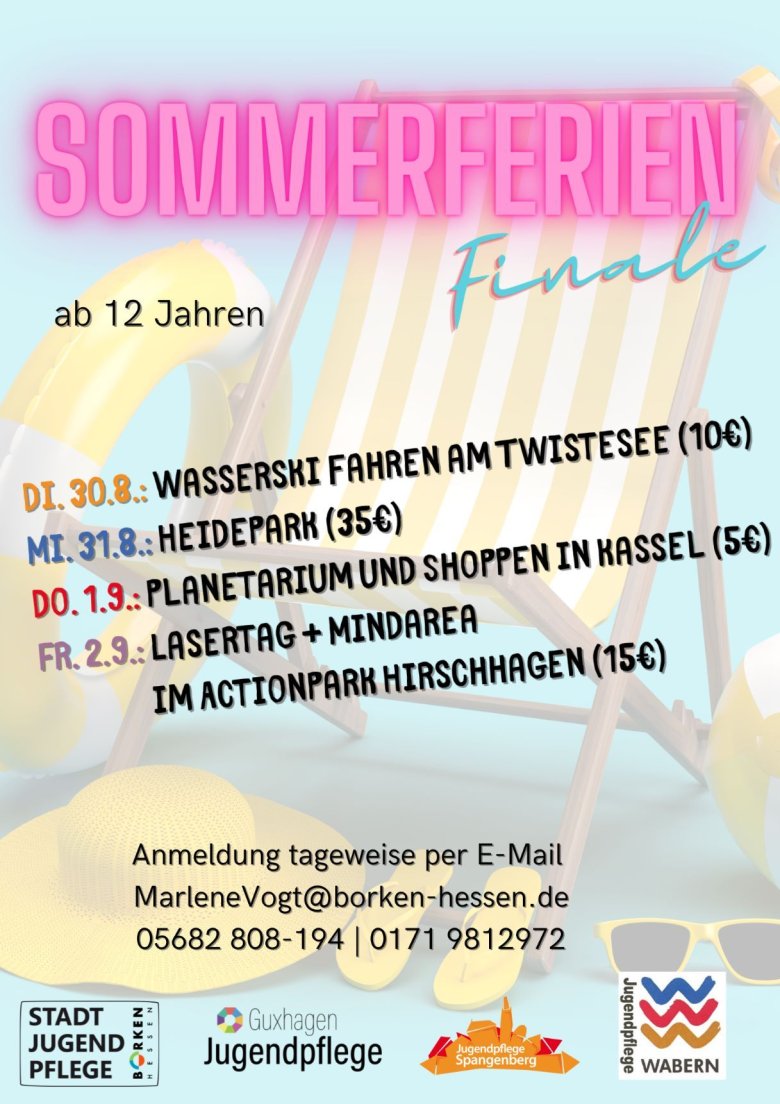 Die letzte Ferienwoche wird noch einmal richtig aufregend für alle Jugendlichen ab 12 Jahren. Gemeinsam mit den Jugendpflegen aus Spangenberg, Guxhagen, Wabern und Borken wurde ein buntes Programm entwickelt. Die Teilnehmeranzahl ist begrenzt, schnell sein lohnt sich also: