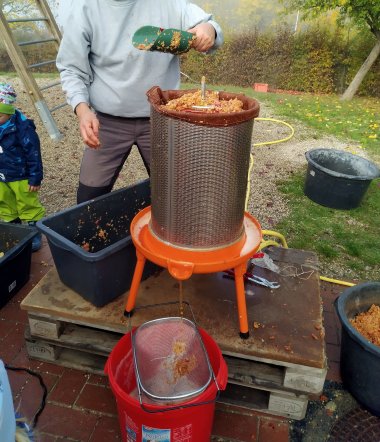 Gruppenweise haben die Kinder geholfen, die Äpfel zu waschen, den Schredderer zu befüllen und dann die Äpfel zu schreddern und schließlich wurden die Äpfel gepresst. Natürlich ließen die Mädchen und Jungen es sich nicht nehmen, zwischendurch den frischen Apfelsaft zu probieren. Für zuhause hatten die Kinder Flaschen mitgebracht und jeder hat eine Flasche frischen Apfelsaft bekommen.