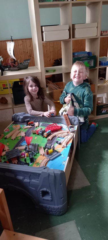 Begeistert wurde der aufgebaute Tisch in Beschlag genommen und mit der Eisenbahn gespielt
