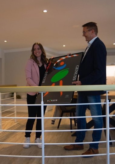Bürgermeister Marcèl Pritsch gratulierte Gemma Akkoyun zur Eröffnung ihres Kosmetikstudios Be Natural Beauty Cosmetics und überreichte das Kunstplakat der Stadt Borken (Hessen).