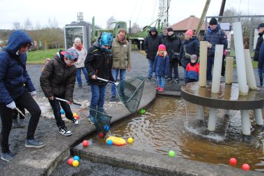 An der ersten Station der Ostereier-WM fischten die WM-Teilnehmer „Schwimmende Ostereier“ aus einem Bassin und lernten ganz nebenbei, dass eine Menge Wasser abgepumpt werden muss, um die Kohle gewinnen zu können.
