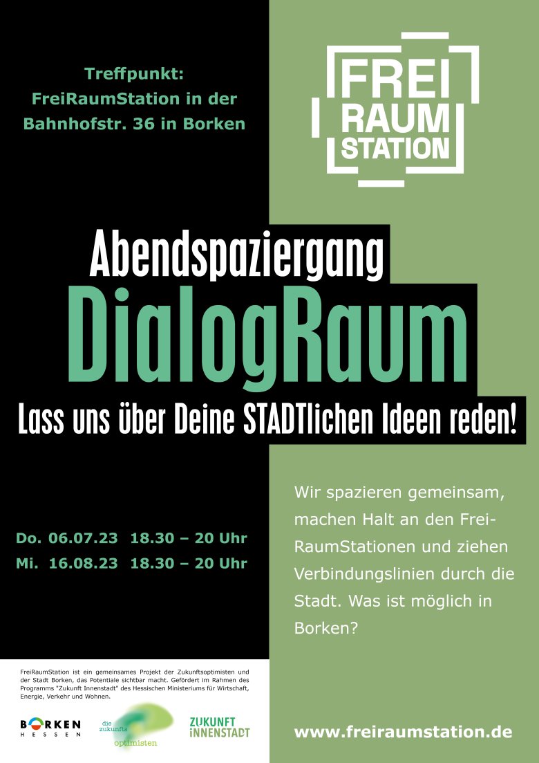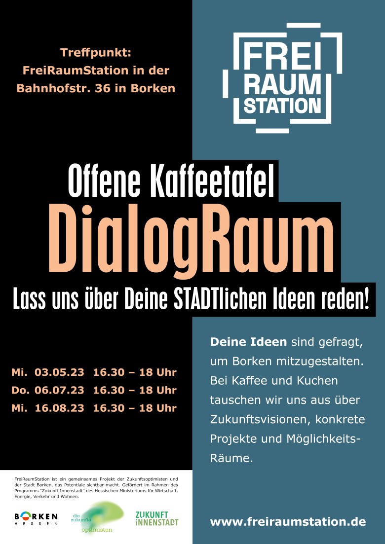 Von Mai bis Ende August kommt ein neues Format hinzu: Die DialogRäume der FreiRaumStation laden alle Menschen, die Borken mitgestalten möchten, ein, ihre Ideen einzubringen und ins Gespräch zu bringen. Dies soll Anlass geben, sich als gemeinsame Akteure der Stadt gegenseitig kennenzulernen und Potentiale vor Ort zu entdecken. Alle Veranstaltungen sind kostenfrei.