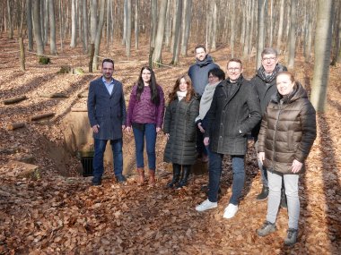 Sie stehen am Tatort, dem Wasserstollen: V. l. Michael Köhler, Bürgermeister Bad Zwesten, Natascha Rath, Tourist-Info Bad Zwesten, Carina Keßler, Tourist-Info Borken, Philipp Rottwilm, Bürgermeister Neuental, Kerstin Kessler, Gemeinde Neuental, Marcèl Pritsch, Bürgermeister Borken, Uwe Heintzemann, Ortsvorsteher Römersberg sowie App-Entwicklerin Leonie Mimpen-Becker Foto: L. Beckmann).