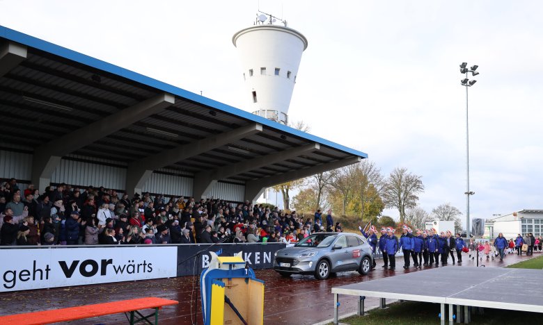 Die Tribühne war gut gefüllt. Ca. 250 Karnevalsfreunde waren gekommen, um die Proklamation und die Tänze der Garden des Borkener Carneval Clubs zu sehen. Hier marschierten die Karnevalisten über die Tartanbahn ins Stadion ein.