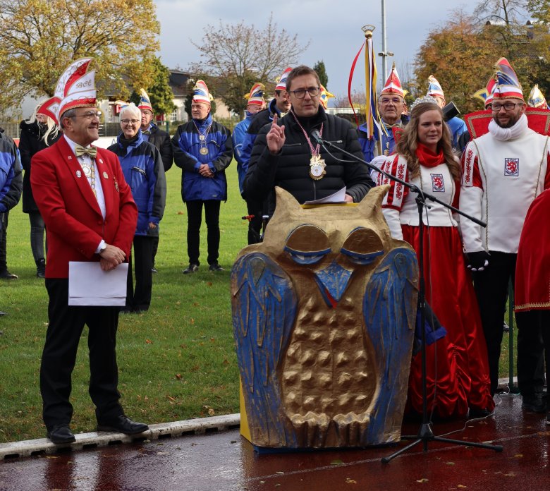 Bürgermeister Marcèl Pritsch hieß in der Eulenbütt die Narrenscharr willkommen. Er berichtete von seiner Zusammenarbeit in der Verwaltung mit Sitzungspräsident Holger Raude in seinem Amt als Erster Stadtrat. Von den Terminen, zu denen er seine Frau Inge entsandte und von der neuen Bühne, die nun auch für die Tänze der Garden zur Verfügung steht.