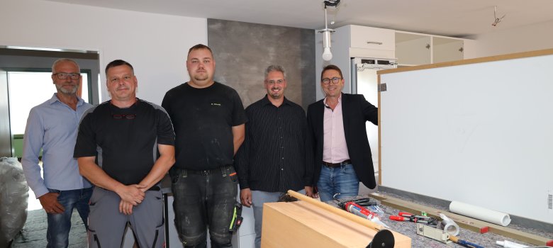 Die Küche inklusive der Kühlzelle im Gemeinschaftshaus Singlis wird komplett erneuert. Beim Besichtigungstermin wurden gerade neue Küchenmöbel aufgebaut. V. l.: Ortsvorsteher Jürgen Zaschke; Markus Appel und Max Maiwald vom städtischen Außendienst; Thomas Sontowski, Bauverwaltung und Bürgermeister Marcèl Pritsch.