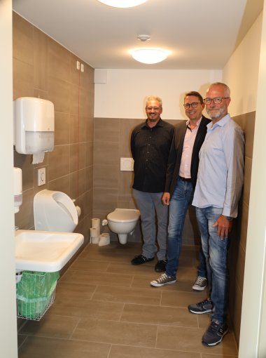 Die WC-Anlage im Obergeschoss ist bereits fertiggestellt. (v. l. Thomas Sontowski, Bauverwaltung; Bürgermeister Marcèl Pritsch und Ortsvorsteher Jürgen Zaschke).