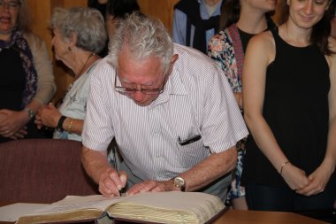 Eintrag ins Goldene Buch der Stadt Borken (Hessen): Harold „Hal“ Katz trägt sich am 18. Mai 2017 in das Goldene Buch der Stadt Borken (Hessen) ein (Foto: Stadtarchiv Borken (Hessen)).