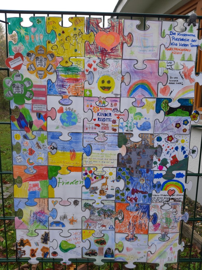 Die Kindertagesstätte Metzen Tannen hat sich gemeinsam mit der Grundschule „Schule am Tor“ an dieser Aktion beteiligt. Kinder, Eltern und Mitarbeitende wurden dazu eingeladen ein Puzzleteil kreativ zu gestalten. Alle haben Ideen, Wünschen und Vorstellungen, für eine bessere Zukunft unserer Kinder in Borken und auf der ganzen Welt zusammengetragen. Ganz im Sinne der UN Kinderrechte.