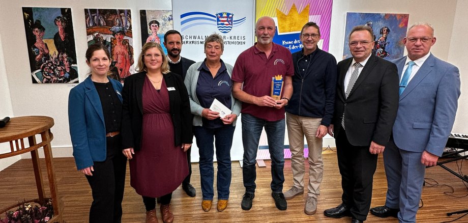 Das Foto zeigt die Preisträgerinnen und Preisträger der Schwalm-Eder-Krone mit Landrat Winfried Becker (3. v. re.), Vize-Landrat Jürgen Kaufmann (re.), Daniela Weber (Ehrenamtsbeauftragte des Schwalm-Eder-Kreises, li.) und Marina Saurwein (Kulturbeauftragte des Schwalm-Eder-Kreises, 2. v. li.) (Foto: SEK).