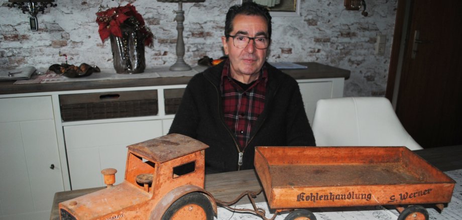 Logisch, dass der Anhänger mit dem Schriftzug „Kohlenhandlung Werner“ auch einen Bezug zum Bergbau erhalten hat. Hans-Peter König stellte den Spielzeugtraktor dem Bergbaumuseum als Dauerleihgabe zur Verfügung.