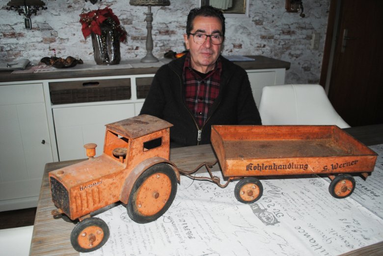 Logisch, dass der Anhänger mit dem Schriftzug „Kohlenhandlung Werner“ auch einen Bezug zum Bergbau erhalten hat. Hans-Peter König stellte den Spielzeugtraktor dem Bergbaumuseum als Dauerleihgabe zur Verfügung.