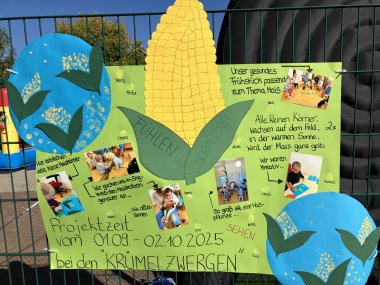 In einer Gruppe wurde der Apfel erst bestaunt und dann gegessen oder später in ein Apfelmus verwandelt. In einer anderen Gruppe wurden echte Sonnenblumen angeschaut, mit Sonnenblumen gedruckt und Sonnenblumenkekse gebacken. Der Mais spielte in der nächsten Gruppe eine große Rolle. Hier wurde unter anderem eine echte Maispflanze untersucht, Maiskörner erfühlt und aus Mais Popcorn hergestellt. Große Augen bekamen die Kinder in der Gruppe in der ein Kürbis bestaunt wurde. Er wurde in verschiedensten Varianten verarbeitet und auch verspeist.