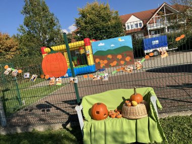 Bunte Kürbisse waren Thema der „Krabbelzwerge“ – im Hintergrund die aufgebaute Hüpfburg.