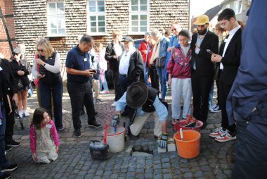 Eine der jüngsten Teilnehmerinnen der Veranstaltung, Lucinda aus den USA, schaute Gunter Demnig neugierig beim Verlegen eines Stolpersteins zu.