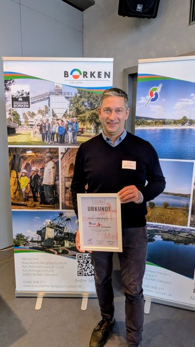 Mirko Ignatz hat für die über 10-jährige Mitgliedschaft des Hessischen Braunkohle Bergbaumuseums bei der MeineCardPlus die Urkunde entgegengenommen. Mit der MeineCardPlus erhalten Gäste in Borken freien Eintritt in den Besucherstollen und den Themenpark Kohle & Energie – und können vom Anreise- bis zum Abreisetag über 160 weitere Freizeitangebote in der Region sowie Bus und Bahn im NVV kostenfrei nutzen.