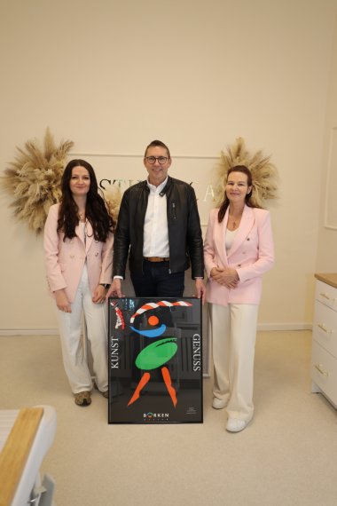 Bürgermeister Marcèl Pritsch gratulierte im Namen der städtischen Körperschaften und überreichte das prämierte Kunstplakat zur Eröffnung. Links Inhaberin Antolina Aktas und rechts Mutter Sabine Hess, in der Arztpraxis sich die Räumlichkeiten von „Aesthetica“ befinden.