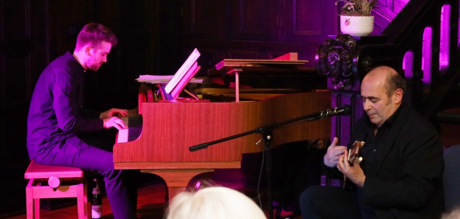 Das Jazz-Duo entfaltete in der stimmungsvollen Atmosphäre des Rathausfoyers ein facettenreiches Programm aus Eigenkompositionen sowie neu interpretierten Werken namhafter südamerikanischer und amerikanischer Jazzkomponisten.